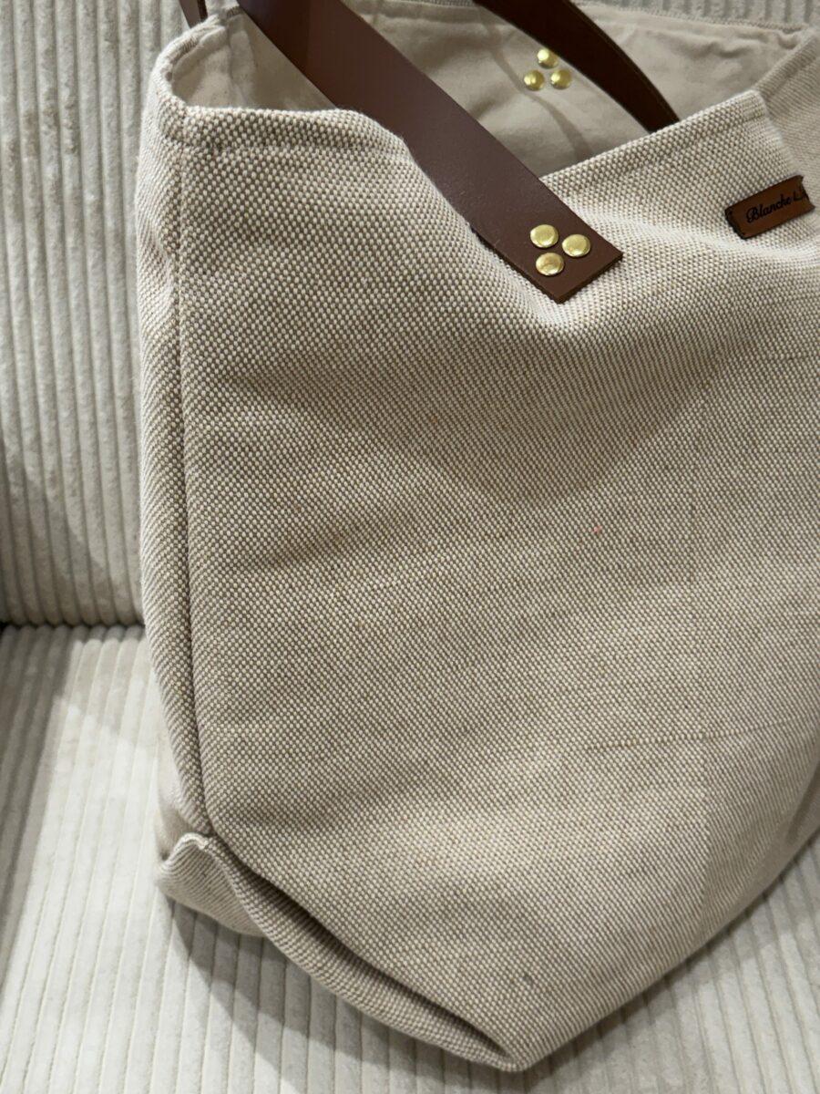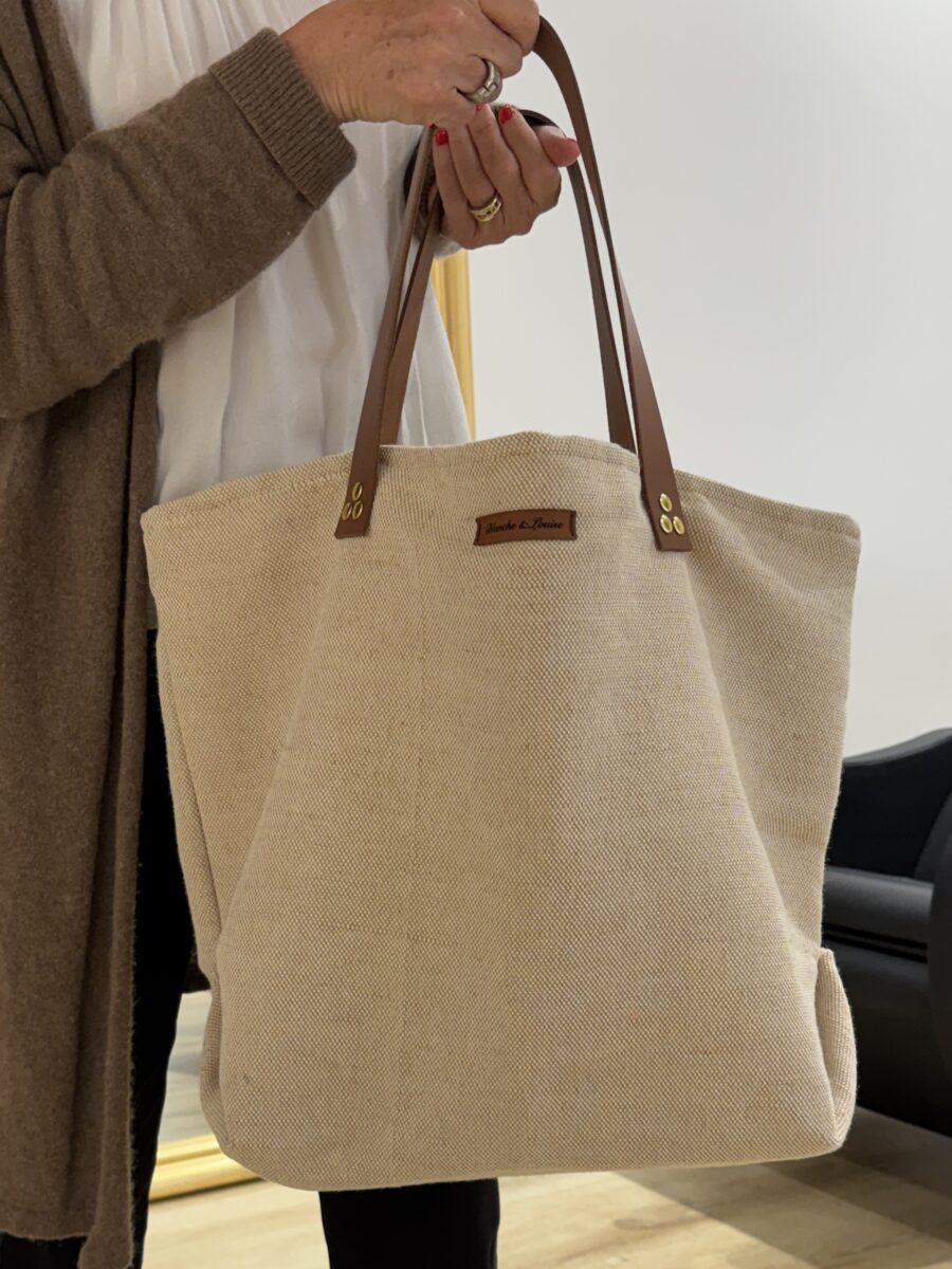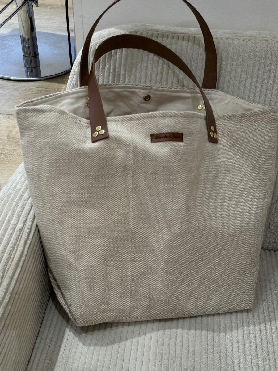 Il est doublé en Canvas écrue et surmonté de anses en cuir fauve du Tarn.