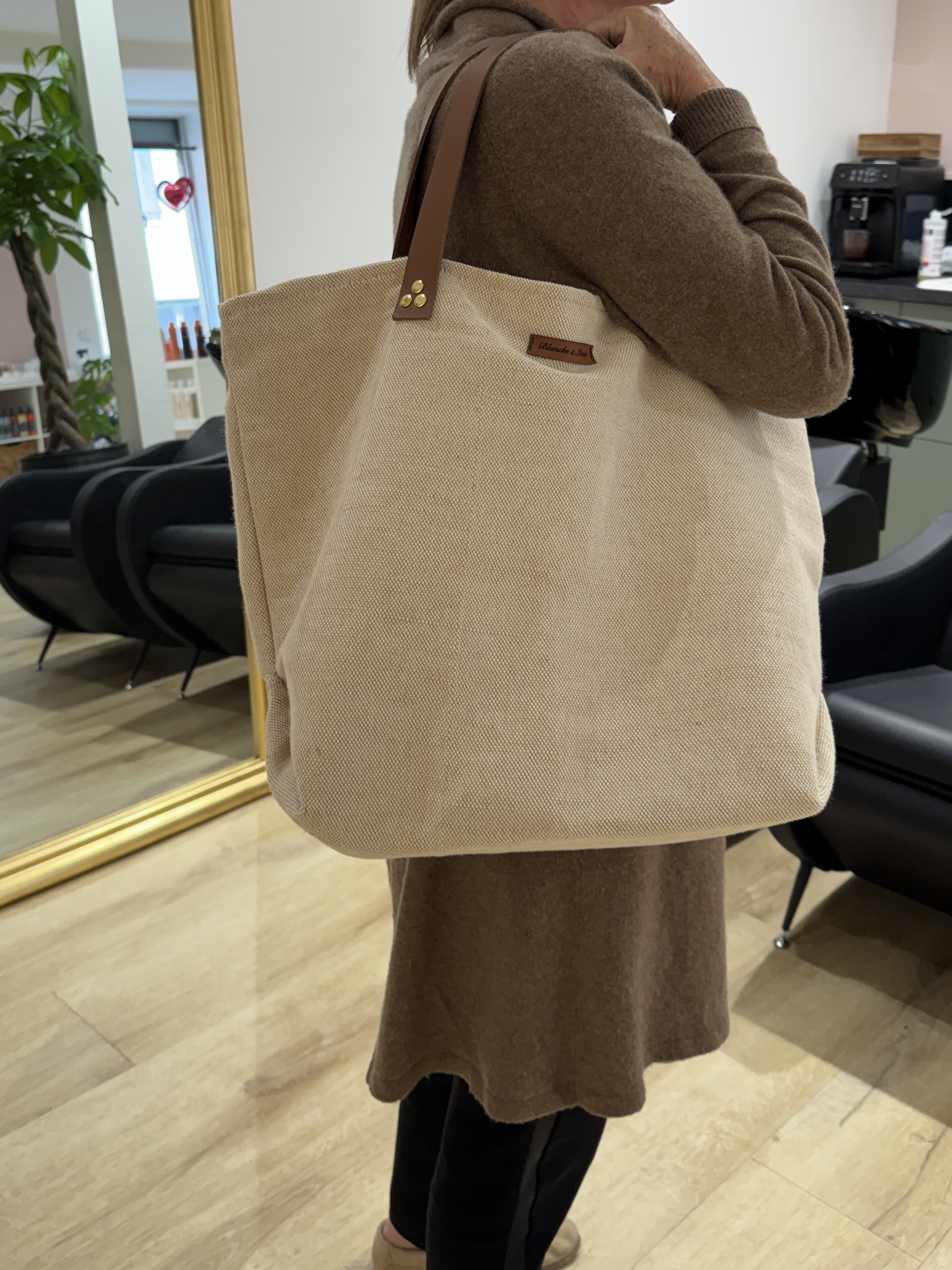 Ce sac cabas en toile de jute et coton conviendra parfaitement avec une tenue décontractée comme avec une tenue habillée.